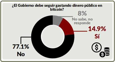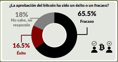 Al ser cuestionados sobre si consideran un éxito o un fracaso la implementación del bitcóin como política pública, el 65.5 % señaló un “fracaso” y un 16,5 % lo consideró un “éxito”, de acuerdo con la encuesta. Además, el 61.3 % de los consultados dijo desaprobar la implementación de BTC; otorgándole por tanto, una nota de 4.61 (en escala de 0 a 10) y un 38.7% lo aprueba dando una nota de 6.