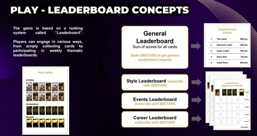 Nafstars alberga tablas de clasificación semanales. Puede suscribirse a sus artistas, dado que son elegibles para esa tabla de clasificación en particular (mínimo 1, máximo 5). La puntuación total se calcula en función de la suma de las puntuaciones de tus cartas, aunque también puedes usar una carta de refuerzo para mejorar tu puntuación. Las clasificaciones de los jugadores se determinan en función de la puntuación de los jugadores individuales al final del período.