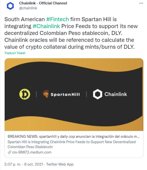 La startup sudamericana Spartan Hill anunció la integración de Chainlink para impulsar su nueva stablecoin descentralizada del peso colombiano, llamada Daily ($DLY).