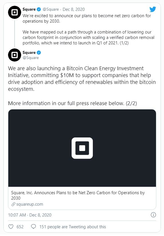 Dado que Square tiene intereses financieros en la criptomoneda alfa, el compromiso medioambiental de la empresa parece estar dirigido a una de las mayores críticas de Bitcoin.