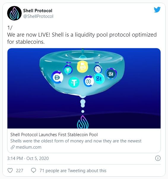 Basado en el concepto de que los shells (escudos, en español) son la forma de dinero más antigua, el nuevo protocolo del mismo nombre se lanzó hoy, 6 de octubre, y ofrece su primer pool de liquidez de stablecoin.