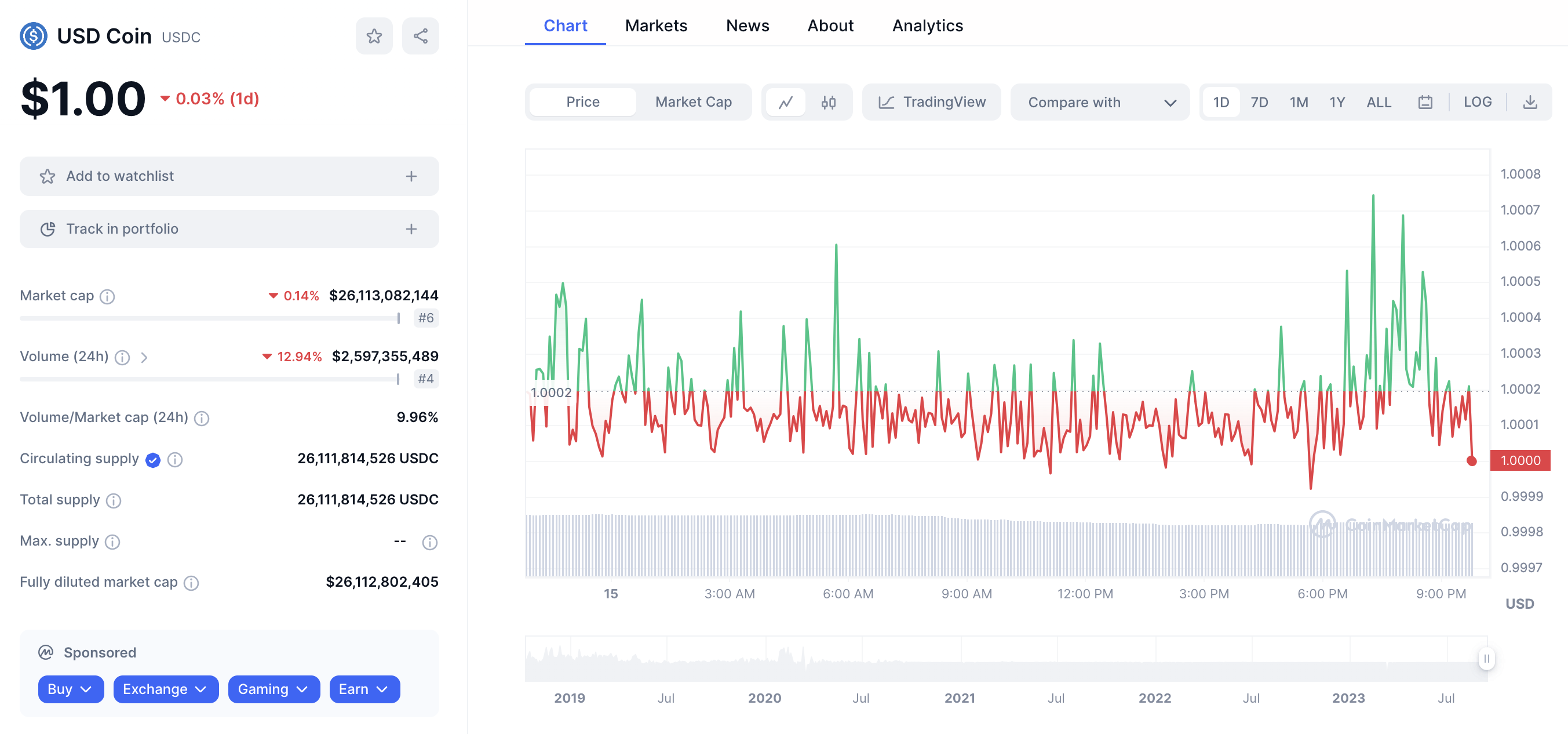 La presencia de mercado de USDC ha disminuido debido a las preocupaciones sobre las reservas, cayendo a una capitalización de mercado de 26 mil millones de dólares.