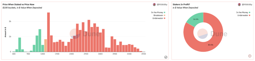 Además, la mayoría de los usuarios han bloqueado Ethereum en staking a un costo mayor. Según Dune Analytics, en este momento solo el 16% de las monedas generan ganancias para sus holders. Si la actualización de Shanghai se hubiera activado hoy, habrían sufrido pérdidas bastante graves.