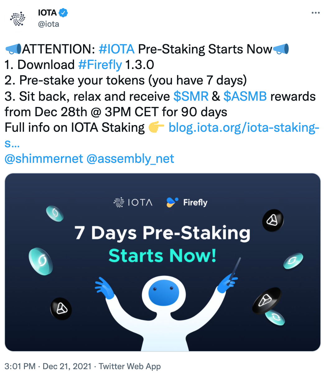 SponsoredDesde el 21 de diciembre se ha abierto el plazo denominado como pre-staking, el equipo pretende dar un plazo de una semana para que sus usuarios puedan preparar todo para el staking de IOTA. El protocolo comenzará a repartir las recompensas a partir del 28 de diciembre durante 90 días hasta completar la distribución actual, aunque anuncian que podría ver futuros airdrops.