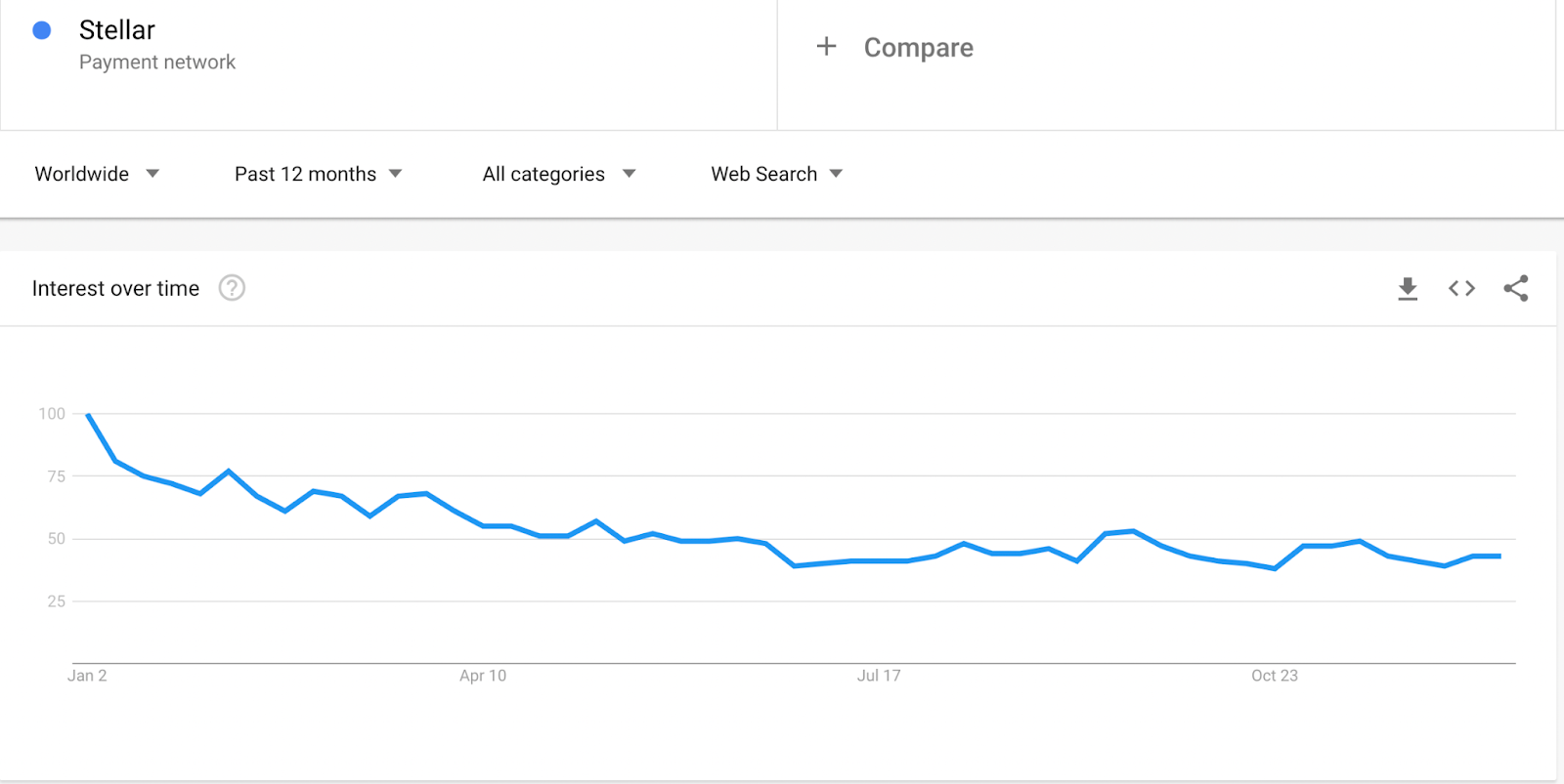 A pesar de los informes de un aumento en las cuentas nuevas en la red Stellar y un aumento del 176% en los pagos, la popularidad de la red está disminuyendo. Según los datos de Google Trends, el Interés a lo largo del tiempo por la red de pago Stellar cayó de 100 en enero a 43 en diciembre.