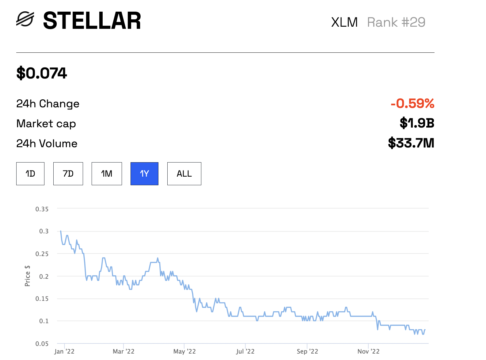 A pesar del crecimiento en el uso de la red, la cartera de los inversores sufre una reducción del 73% en 2022. El token nativo XLM cotizaba alrededor de 0,3 dólares durante enero de 2021, que ahora ha bajado a alrededor de 0,074 dólares.
