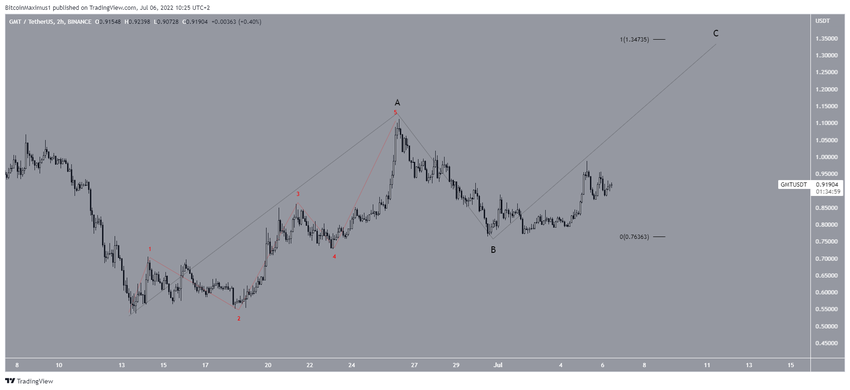 GMT había estado cayendo por debajo de una línea de resistencia descendente desde el 13 de mayo. El movimiento a la baja condujo a un mínimo de 0,53 dólares el 13 de junio. Inicialmente, esto provocó una ruptura del área de soporte horizontal de 0,84 dólares.