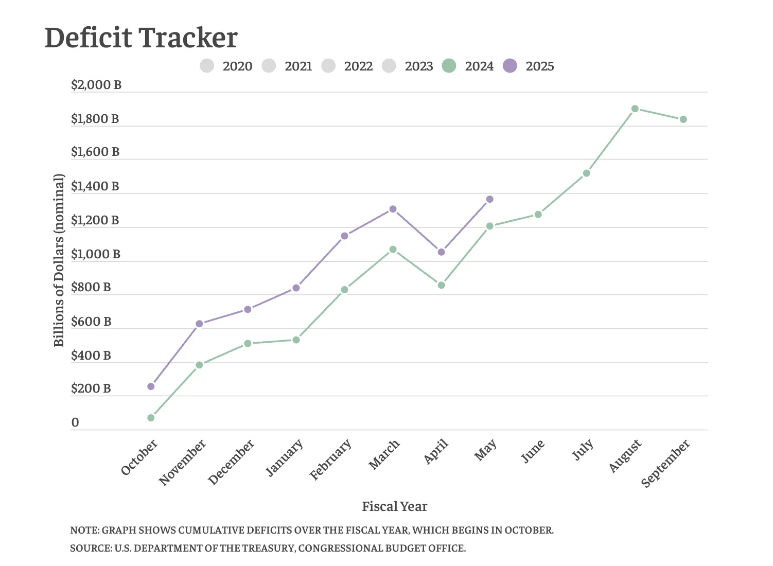 Según el Centro de Política Bipartidista, el déficit fiscal del gobierno federal alcanzó 1,1 billones de dólares en abril de 2025, un aumento del 13% respecto al año pasado: