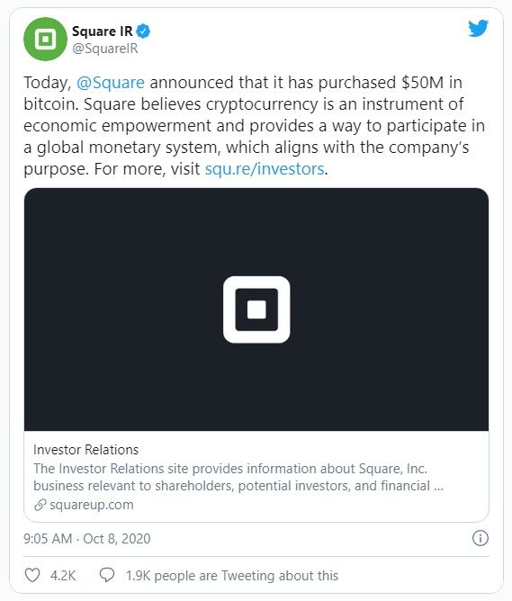 Tras el anuncio de Saylor se produjo la declaración más reciente de la empresa de pagos del CEO de Twitter, Jack Dorsey, Square. La firma anunció a principios de octubre que también había convertido 50 millones de dólares de sus tenencias de efectivo en BTC.