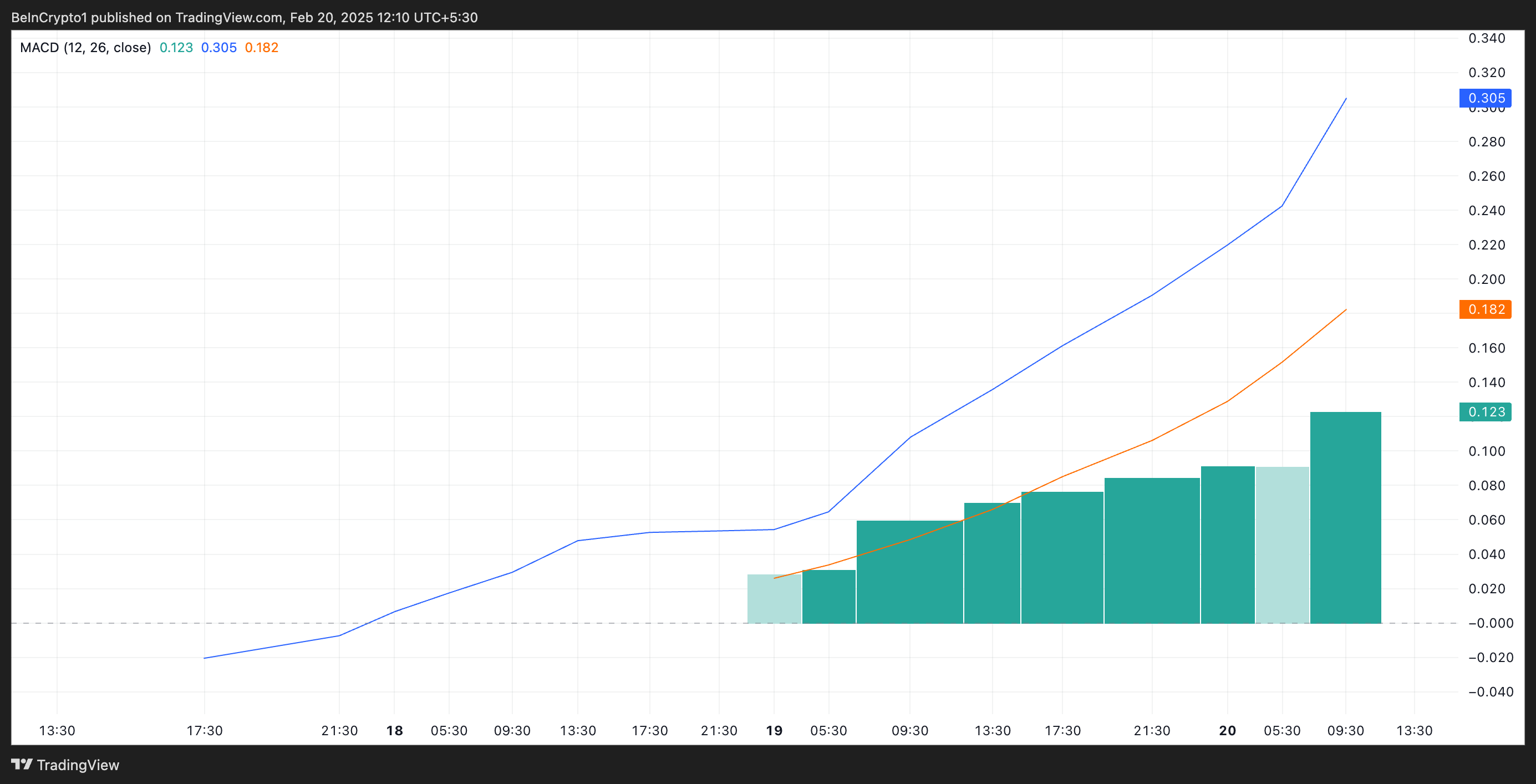 Además, su configuración de Moving Average Convergence Divergence (MACD) respalda esta perspectiva alcista. Al momento de escribir, la línea MACD de IP (azul) se encuentra por encima de su línea de señal (naranja).