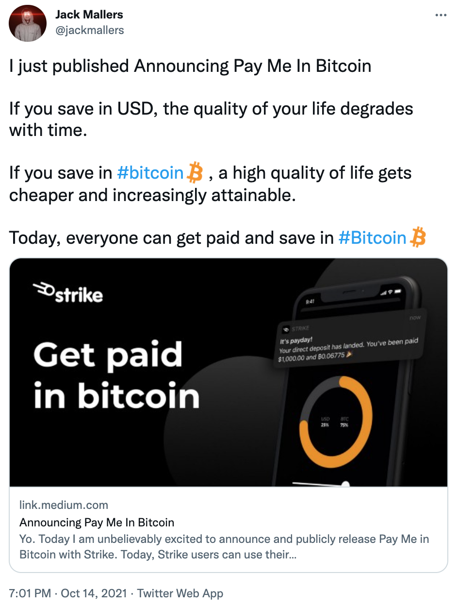 Hoy, 14 de octubre, la popular cartera instantánea que puede mandar BTC con unas tarifas virtualmente gratuitas, mediante el Lightning Network (LN), ha anunciado un nuevo producto, Pay Me In Bitcoin (Págame en Bitcoin). Este nuevo producto expande los servicios de los usuarios de Strike como explaya su CEO y fundador Jack Mallers: