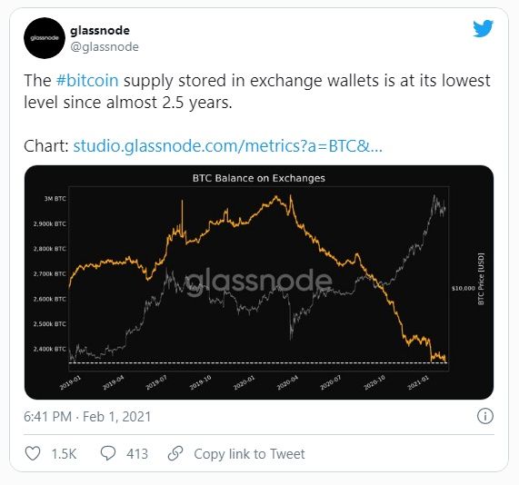 La firma de análisis de blockchain Glassnode ha revelado que el suministro de Bitcoin (BTC) en los monederos de exchanges se encuentra ahora en su nivel más bajo por primera vez desde hace casi 3 años.