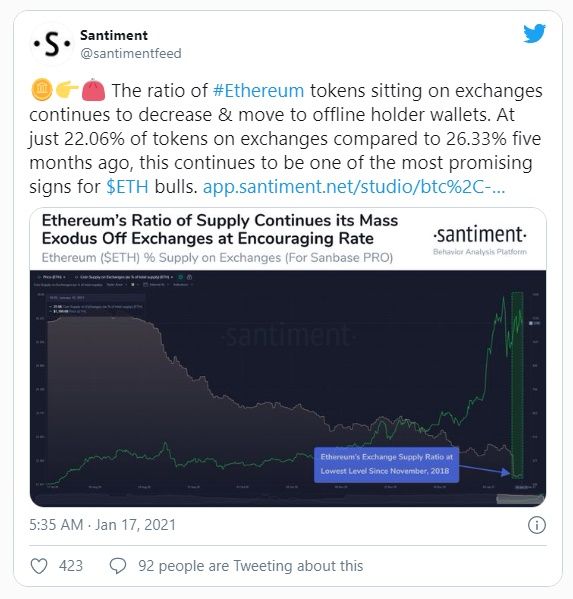 La proporción de suministro de Ethereum, que mide la cantidad de ETH disponible en los exchanges de criptomonedas, continúa cayendo fuertemente. Está alcanzando niveles no vistos desde noviembre de 2018. Santiment, una firma de análisis de datos de blockchain, tuiteó la noticia.