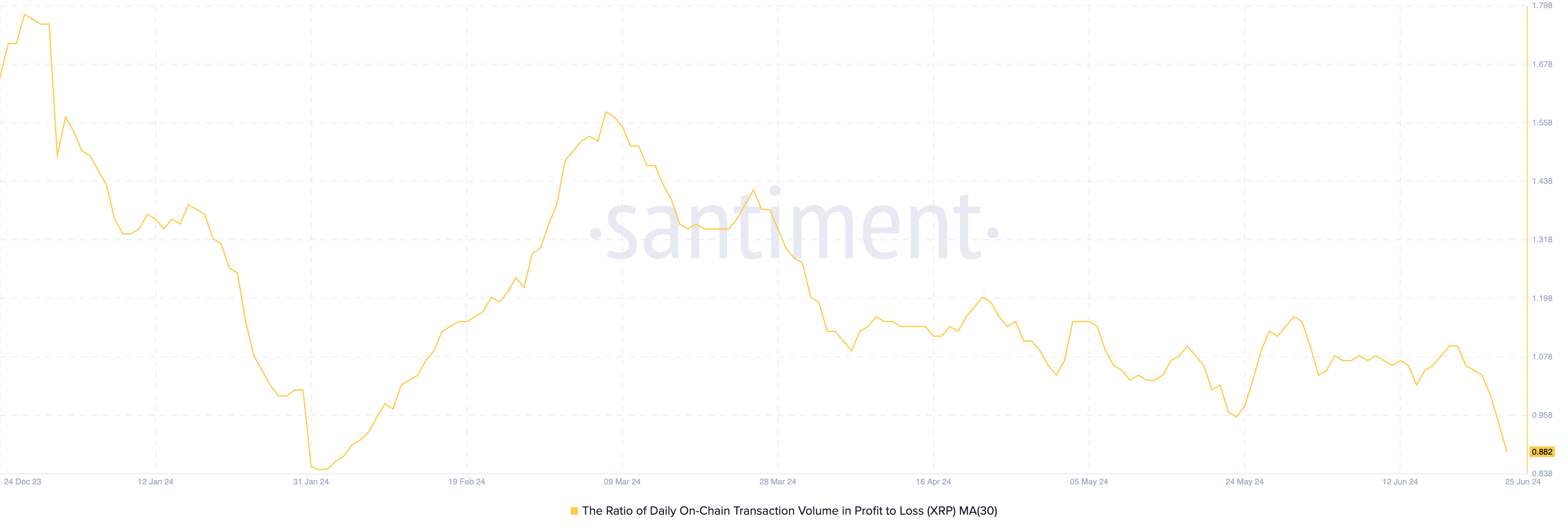 La constante disminución en el precio de XRP es en parte atribuible a las pérdidas que sus holders han sufrido recientemente. Por ejemplo, su ratio diario de volumen de transacciones en beneficio frente a pérdidas (evaluado usando una media móvil de 30 días) es de 0.88 en este momento.