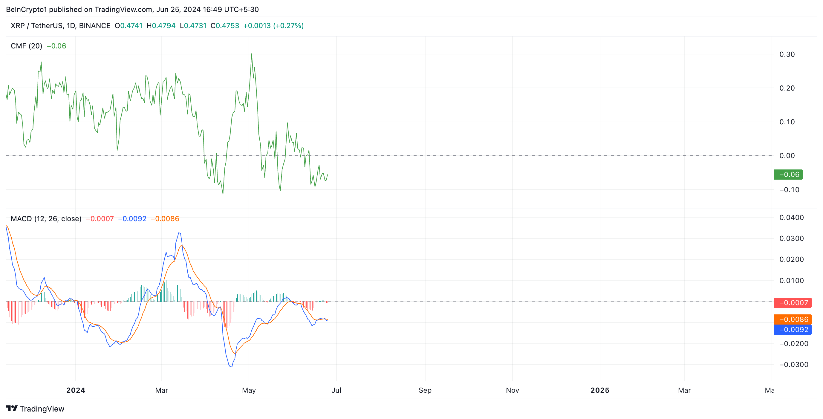 Sin embargo, la reciente acción del precio de XRP no ha mostrado ningún potencial para un rebote significativo a corto plazo. En el momento de escribir esto, XRP se negocia a 0.47 dólares. En el último mes, el precio de la altcoin ha caído un 12%.