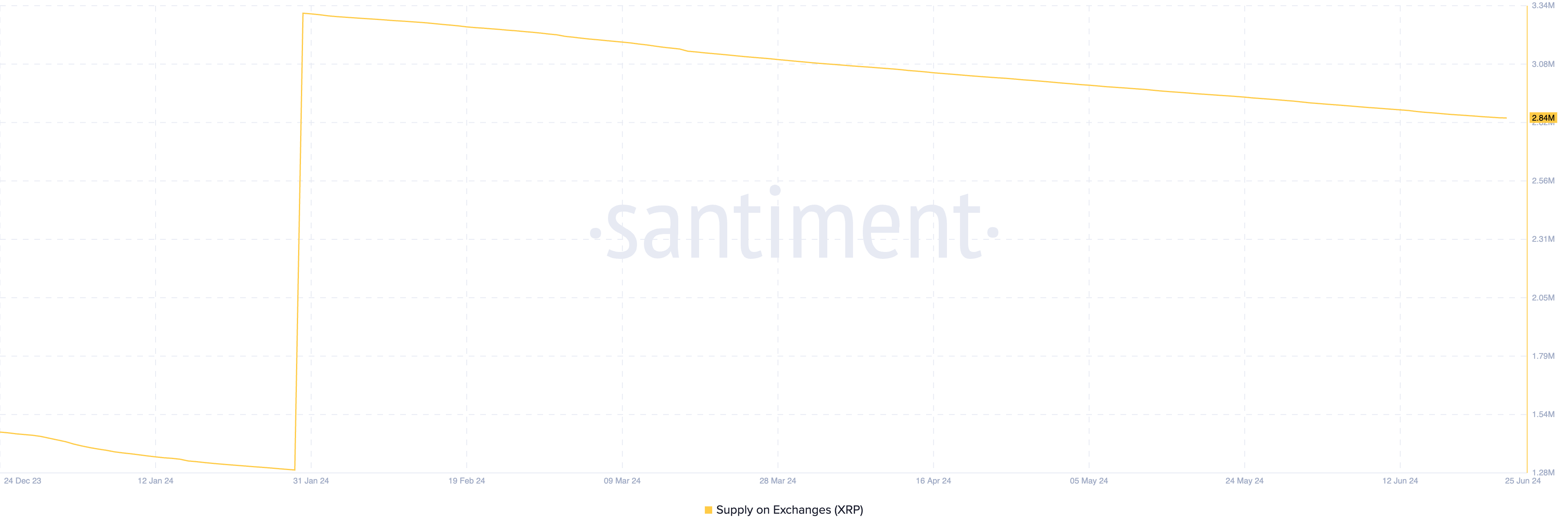 Al momento de esta publicación, el suministro del token en los exchanges era de 2.84 millones de XRP, el nivel más bajo desde el 1 de enero.