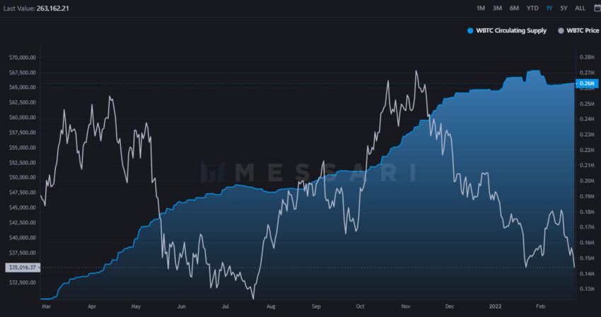 Sin embargo, esa tendencia está comenzando a mostrar signos de reversión ya que la oferta se ha estancado en los últimos meses. Según Messari, el suministro de WBTC se ha estancado desde diciembre después de alcanzar un máximo histórico de 271,257 BTC en enero.