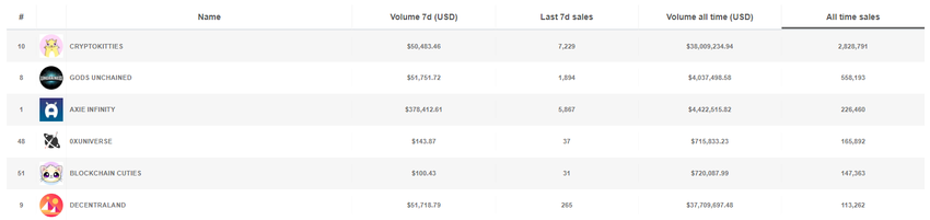 La plataforma NFT más popular, en términos de ventas, sigue siendo CryptoKitties. Según la plataforma de datos NonFungible, el juego ha registrado más de 38 millones de dólares en ventas, lo que eclipsa los 4,57 millones de dólares en ventas de SuperRares.