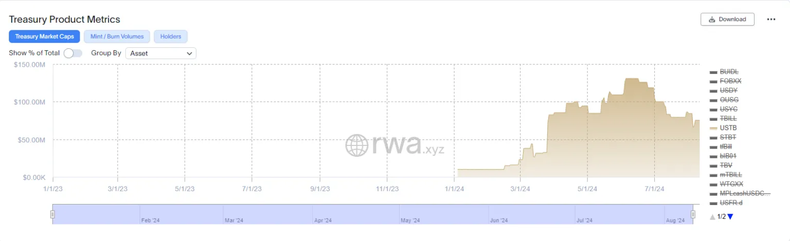 Los datos de RWA.xyz muestran que a partir del 11 de agosto, el USTB de Superstate tiene una capitalización de mercado de 75,31 millones de dólares. Esta cifra lo convierte en el séptimo fondo de tesorería tokenizado más grande del mercado, según BeInCrypto. Notablemente, USTB alcanzó este número en solo aproximadamente seis meses después de su debut en febrero.