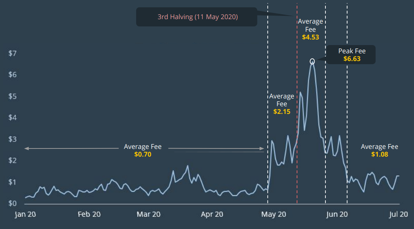 SponsoredEntre enero y marzo, la tarifa promedio de transacción fue de aproximadamente 0.70 dólares, pero durante y después del último halving (reducción a la mitad, en español) de Bitcoin -que ocurrió el 11 de mayo-, la tarifa promedio de transacción se disparó 6.5 veces a 4.53 dólares.
