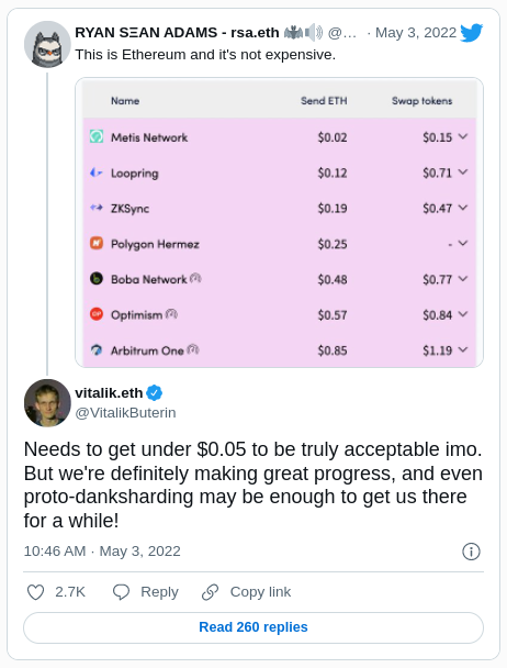 “Necesita obtener menos de 0.05 dólares para ser realmente aceptable en mi opinión. ¡Pero definitivamente estamos haciendo un gran progreso, e incluso el proto-dunksharding puede ser suficiente para llevarnos allí por un tiempo!
