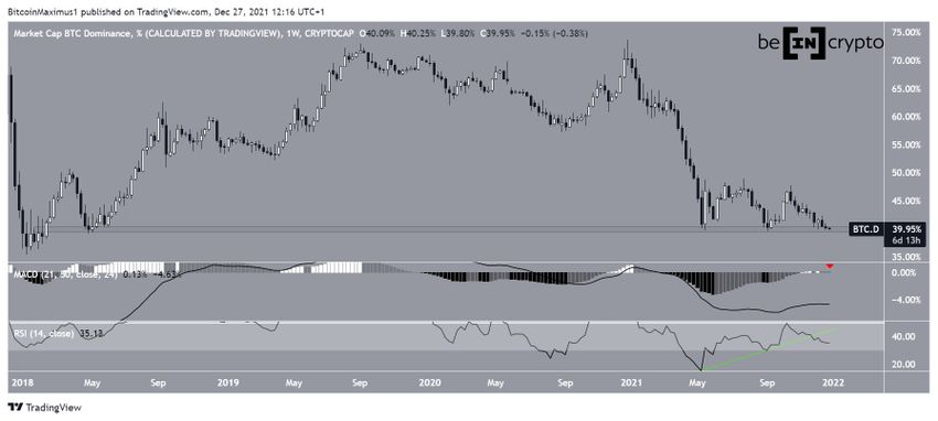 El 19 de mayo, la tasa de dominio de Bitcoin (BTCD) cayó a un mínimo del 39,66% y rebotó. Al principio, parecía que la tasa iniciaría un movimiento alcista. Sin embargo, creó dos máximos más bajos en su lugar, y está de vuelta en sus mínimos de mayo.
