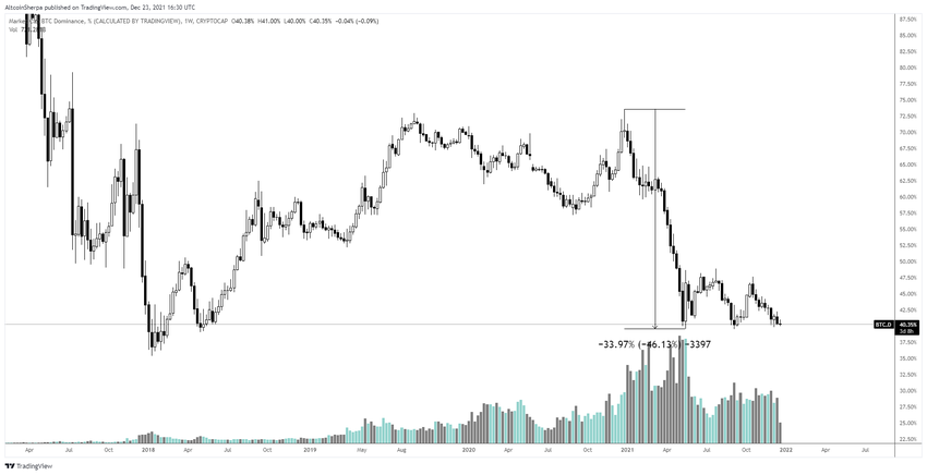 El trader de criptomonedas @AltcoinSherpa describió un gráfico de BTCD, que muestra que la tasa ha caído un 46% desde los máximos anuales. Como se describió anteriormente, parece que el movimiento a la baja continuará.