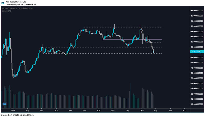 La tasa de dominio de Bitcoin (BTCD) ha caído de un área de soporte a largo plazo y alcanzó niveles no vistos desde 2018.