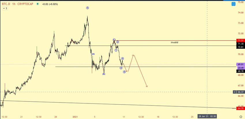 Para concluir, BTCD debería seguir disminuyendo hasta llegar a la línea de soporte ascendente y a la zona en un 66%.