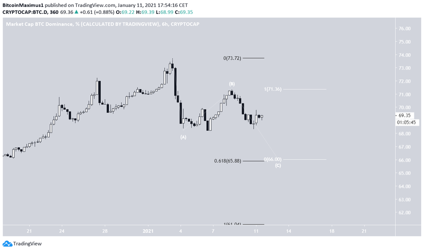 Si las ondas A:C tienen una relación de 1:1, lo cual es muy común en tales correcciones, el BTCD caerá hasta el 66%, ajustándose al nivel de retroceso de 0,618 Fib.