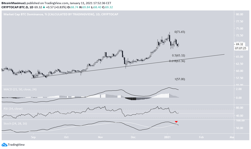 La Tasa de Dominio de Bitcoin (BTCD) ha sido rechazada por una zona de resistencia a largo plazo y actualmente está disminuyendo. El BTCD debería bajar hasta que alcance la línea de soporte ascendente cerca del 66%.