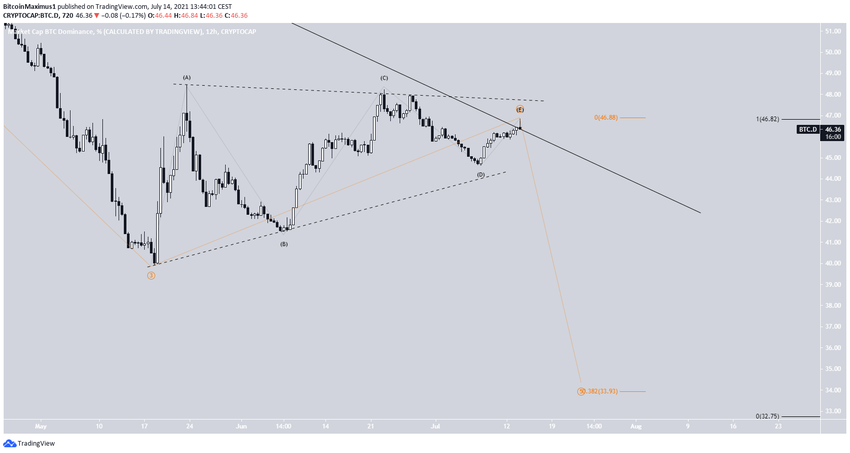 SponsoredLa posibilidad más probable sugiere que la BTCD se encuentra actualmente en la cuarta onda de un impulso bajista, que ha tomado la forma de un triángulo de cuarta onda.
