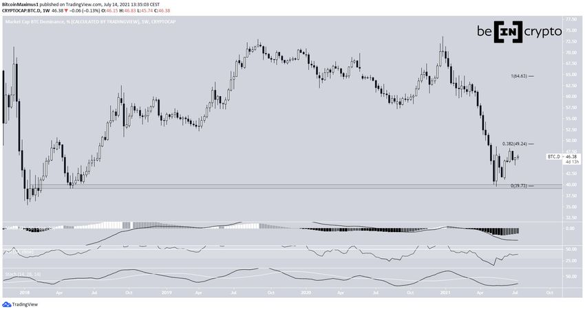 La BTCD se ha estado moviendo a la baja desde enero de 2021, cuando alcanzó un máximo del 73,63%. El movimiento a la baja continuó hasta alcanzar un mínimo del 42,68% en mayo.