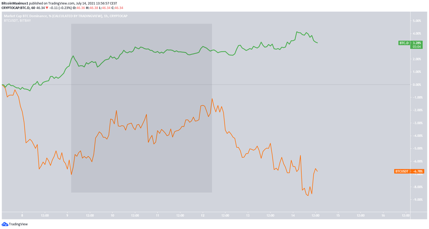 La relación entre BTC (naranja) y la BTCD (verde) fue positiva del 9 al 12 de julio, lo que significa que un aumento en el precio de BTC también provocó un aumento en la tasa de dominio de Bitcoin.