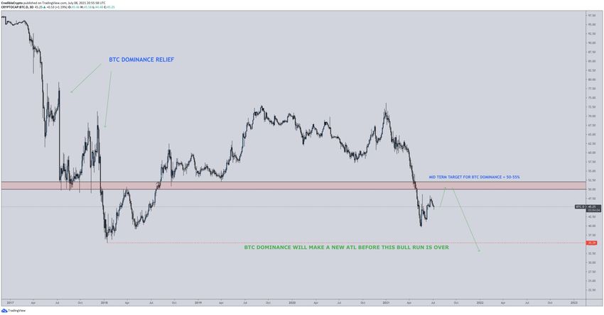 El trader de criptomonedas @Crediblecrypto declaró que, a pesar del aumento continuo, esperaba que la BTCD eventualmente cayera y alcanzara un nuevo mínimo histórico.