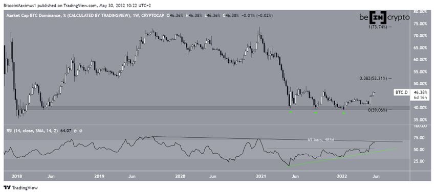 La BTCD alcanzó un mínimo del 39,2% en enero de 2022, rebotando en el área de soporte a largo plazo del 40% por tercera vez (iconos verdes). No ha alcanzado un mínimo por debajo de este nivel desde principios de 2018. Hasta ahora, el rebote ha llevado a un máximo del 46,90% el 27 de mayo.