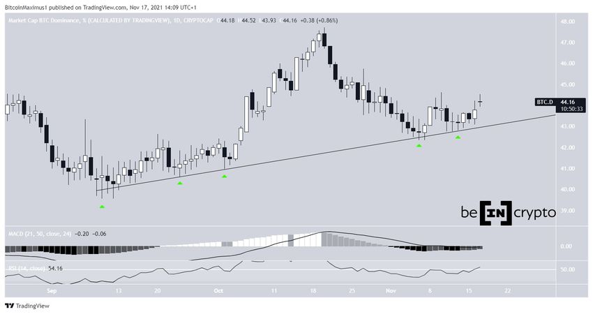 La BTCD ha estado disminuyendo desde el 20 de octubre, cuando alcanzó un máximo del 47,72%. El movimiento a la baja continuó hasta el 6 de noviembre, cuando la tasa alcanzó un mínimo de 42,37%.