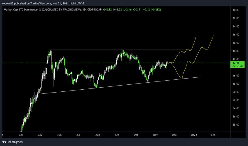 La tasa de dominio de Bitcoin (BTCD) se está acercando a sus mínimos anuales y eventualmente podría alcanzar un nuevo mínimo histórico.