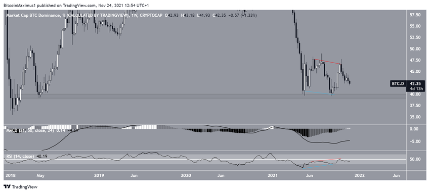El área de soporte más cercana para la BTCD está en 39.80%, creada por los mínimos anuales.