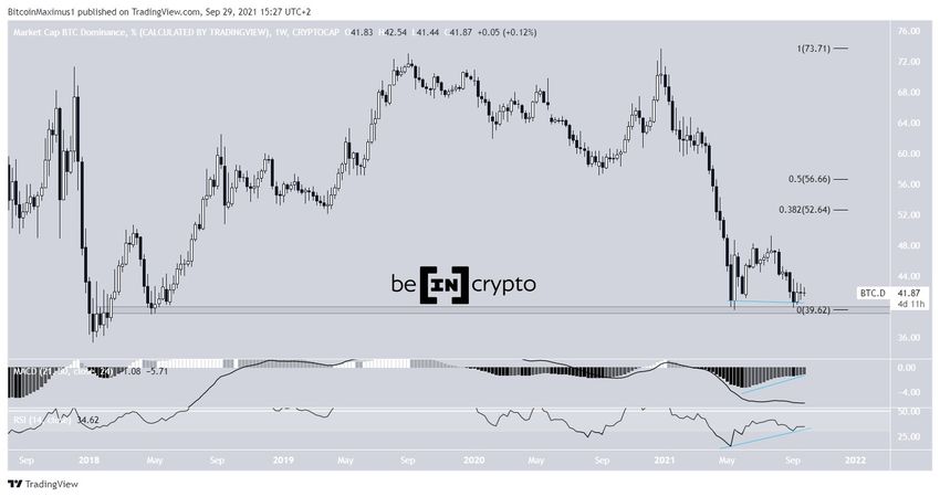 La tasa de dominio de Bitcoin (BTCD) ha creado un doble fondo en el área de soporte a largo plazo del 39,50%.