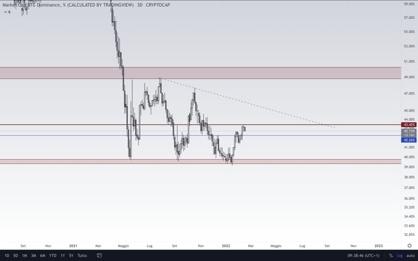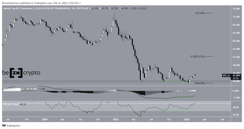 El gráfico semanal muestra que la BTCD ha rebotado en el área de soporte horizontal del 40% varias veces, en mayo y septiembre de 2021 y enero de 2022. El dominio de Bitcoin no ha alcanzado un cierre por debajo de este área horizontal desde principios de 2018.