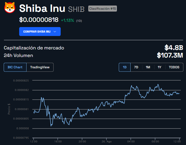 Al momento de la publicación, el token SHIB cotiza en 0.00000818 dólares tras aumentar 1.13% en las últimas 24 horas, según datos de BeInCrypto.