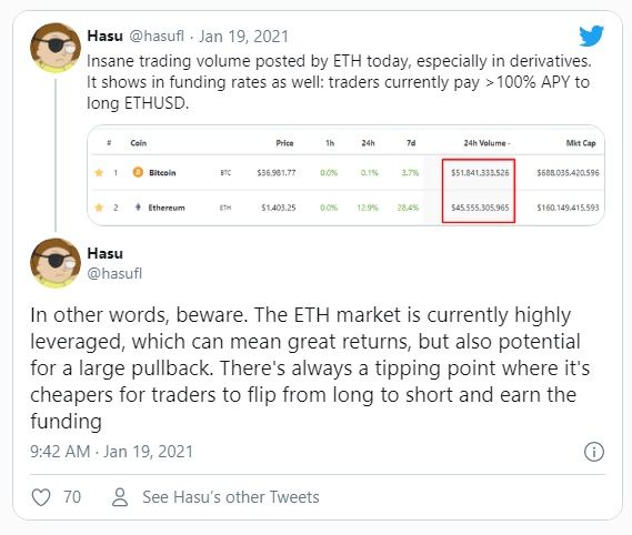 Según el popular investigador Hasu de Deribit, el mercado de Ethereum está actualmente muy apalancado. Con la mayoría de los traders posicionándose en largo, hay un aumento notable en la tasa de financiación.