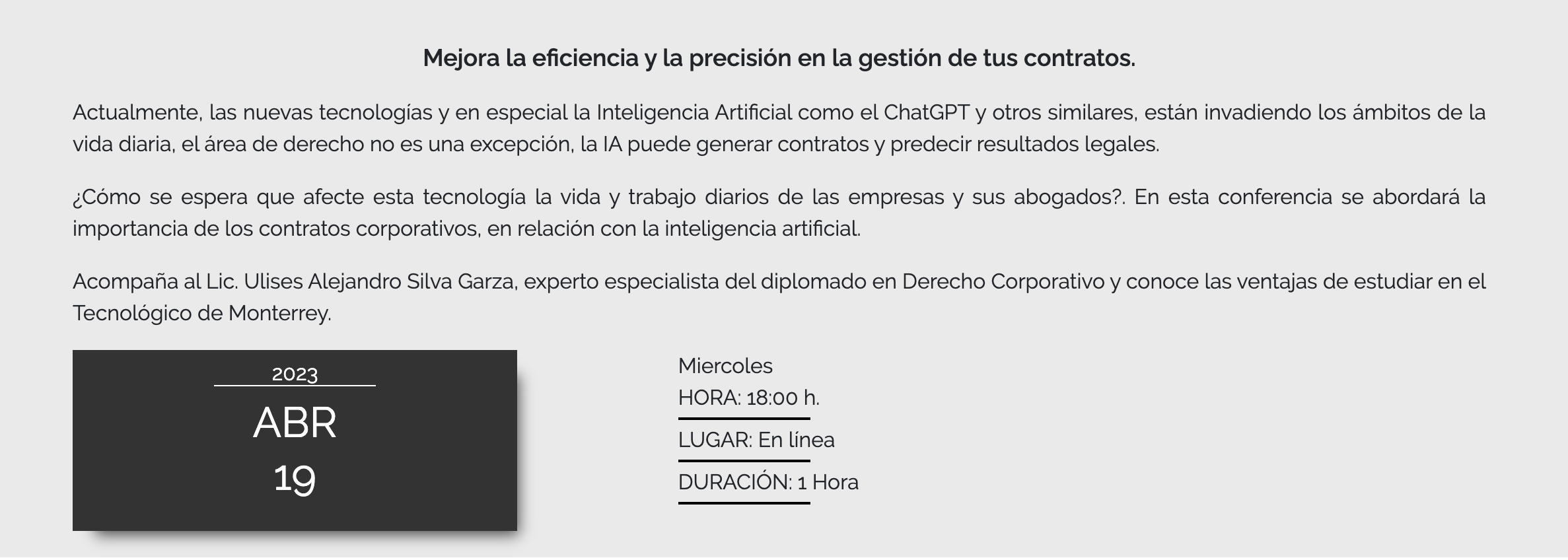 La conferencia del Tec de Monterrey estará enfocada en la eficiencia y mejora de contratos, y será brindada por Ulises Alejandro Silva Garza, especialista del diplomado de Derecho Corporativo de la institución educativa. Al ser gratuito, los interesados no deberán pagar costo alguno, solo llenar un formulario de asistencia virtual.