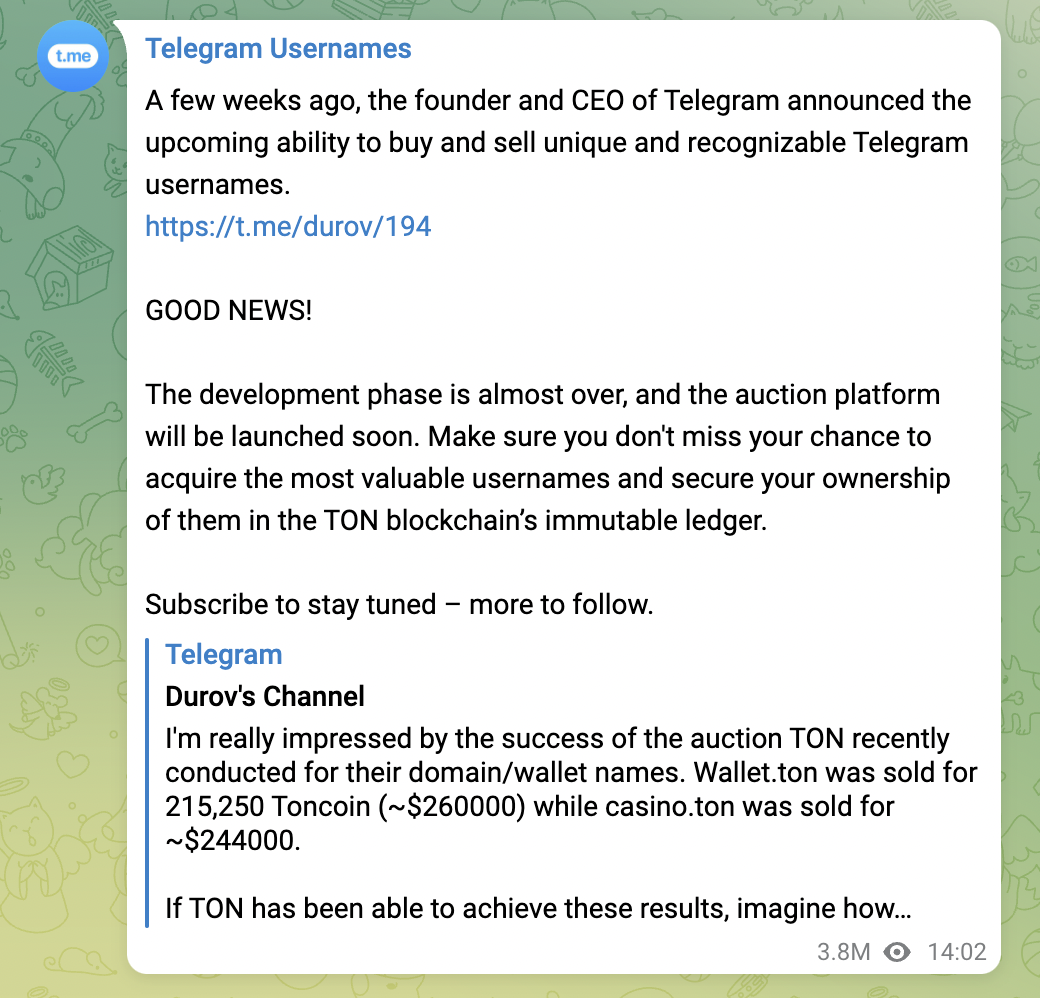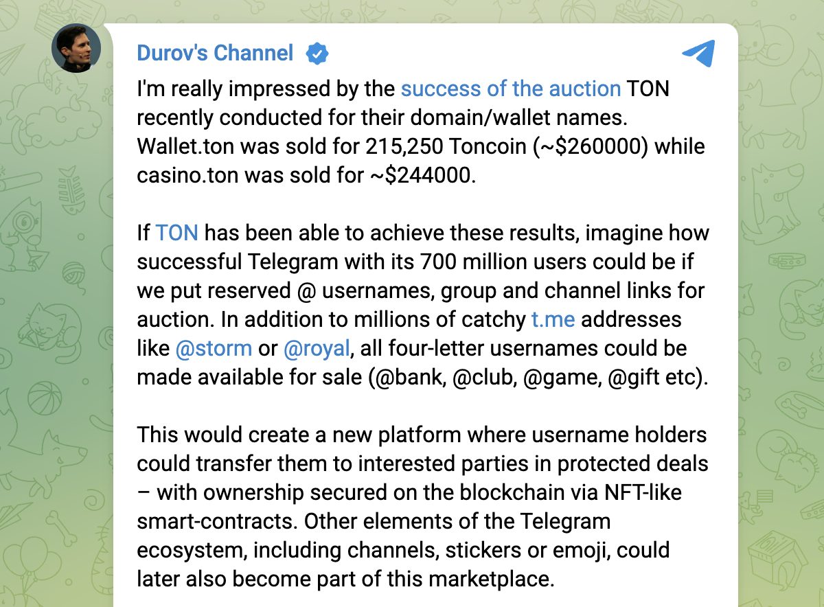 Sponsored“Si TON ha sido capaz de lograr estos resultados, imagina el éxito que podría tener Telegram con sus 700 millones de usuarios si pusiéramos a subasta los nombres de usuario @ reservados, los enlaces de grupos y canales. Además de millones de direcciones pegadizas de t.me como @storm o @royal, todos los nombres de usuario de cuatro letras podrían estar disponibles para la venta (@bank, @club, @game, @gift, etc.)”.