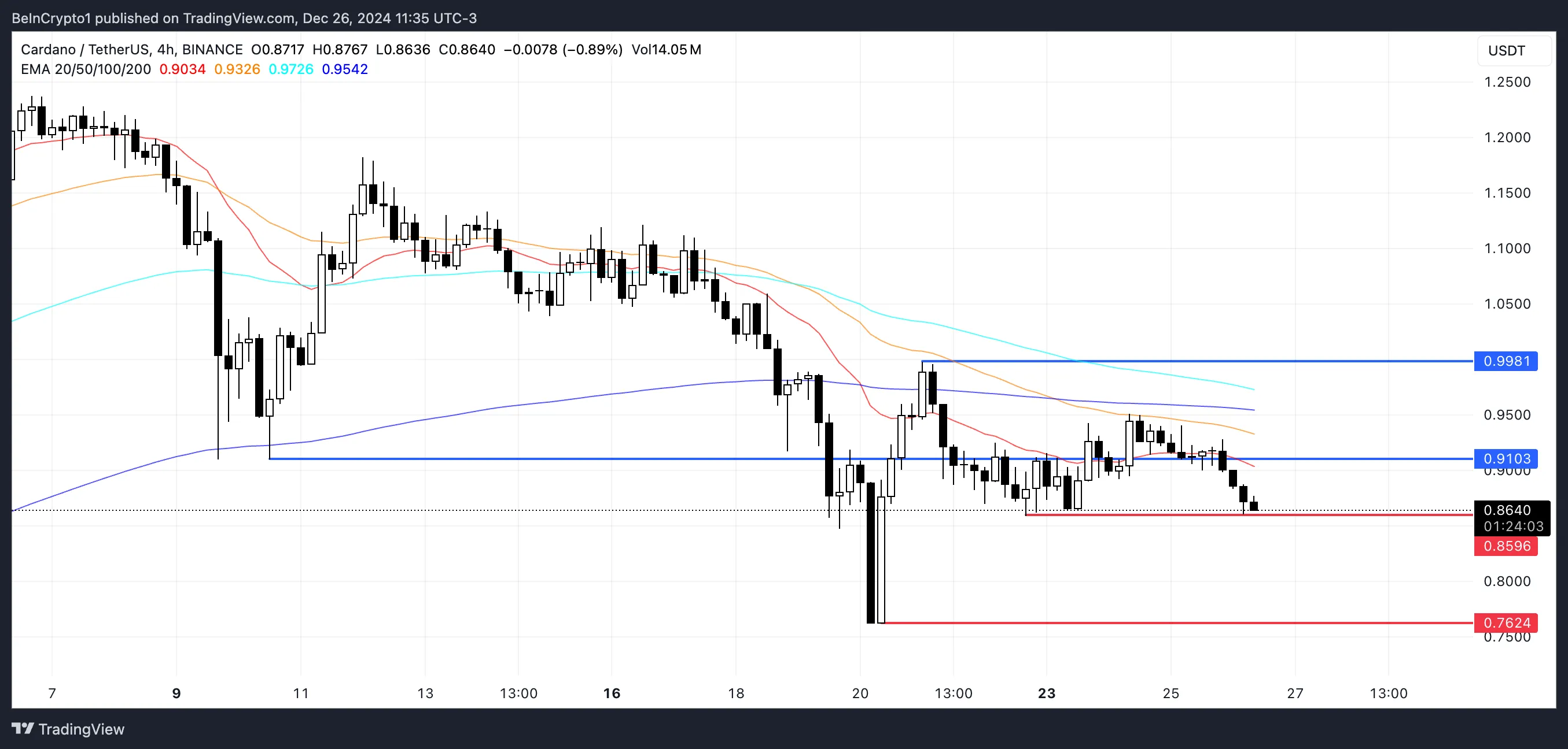 La actividad de las ballenas, que se ha estabilizado desde el 22 de diciembre, sugiere una presión de venta reducida, apuntando hacia una consolidación. Los traders están ahora monitoreando de cerca el nivel de soporte de 0,859 dólares, ya que su fortaleza determinará si el precio de ADA puede recuperarse hacia 1 dólar o enfrentar más caídas hasta 0,76 dólares.