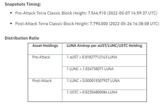 “Las distribuciones de airdrop restantes de Terra (LUNA) [se realizarán] a partir de diciembre de 2022 o junio de 2023 en adelante, según corresponda. Esto se llevará a cabo durante un período de 24 o 48 meses”.