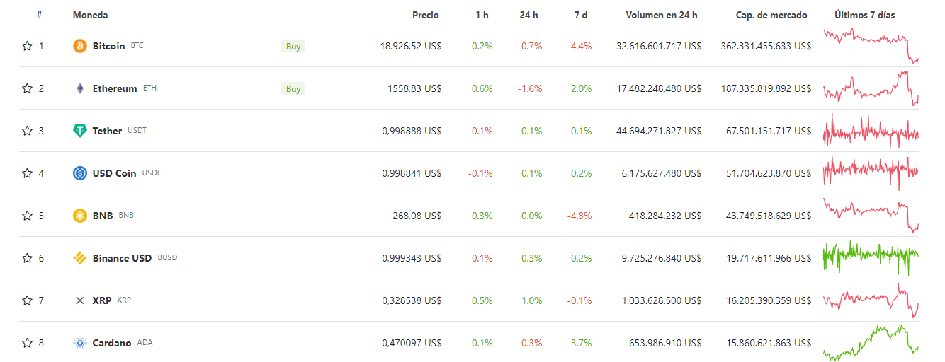 A pesar del fuerte golpe recibido por las principales criptomonedas, paulatinamente se acercan a cotizar en números verdes. Bitcoin (BTC) cotiza en 18,926 dólares, registrando una caída del 0.7%.