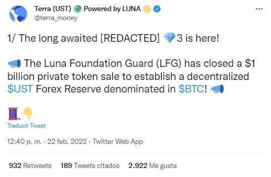 El martes 22 de febrero, la Luna Foundation Guard anunció el cierre de una venta privada de tokens 1,000 millones de dólares “para establecer una reserva de divisas de $UST descentralizada denominada en $BTC”.