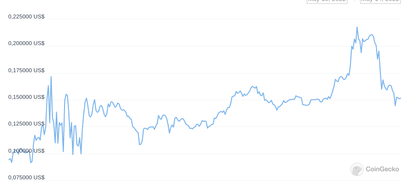 Tras desplomarse un 100% durante la última semana, el token LUNA ha registrado un crecimiento de más de 1,900% en las últimas 24 horas. Tras alcanzar el día de ayer un mínimo histórico de 0,0000009 dólares, subió hasta los 0.00058 dólares.
